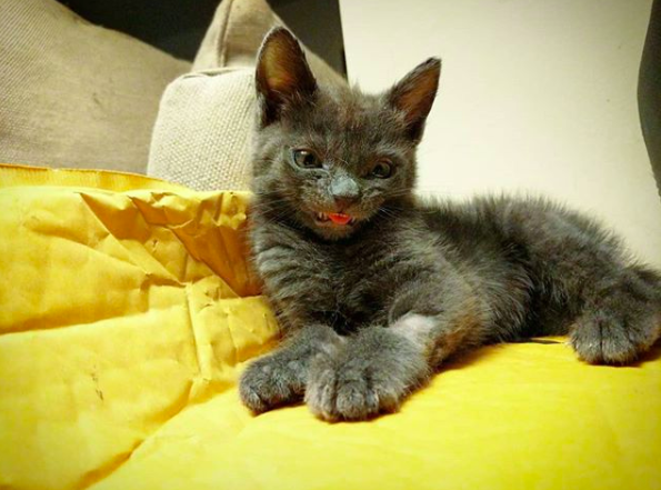 Wolfie was rescued after living behind a building with his siblings on Skid Row in Downtown Los Angeles. From the moment he arrived in his new home, there was always something different about Wolfie. He was a very sickly kitten, and his mom eventually discovered that he was born with a severely kinked esophagus. Once he started eating an all-liquid diet, he became much healthier, and has now transformed into the funniest, sweetest cat.