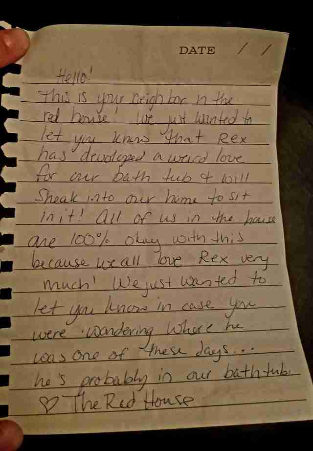 “Hello!” the note begins. “This is your neighbor in the red house! We just wanted to let you know that Rex has developed a weird love for our bathtub + will sneak into our home to sit in it! All of us in the house are 100% okay with this because we all love Rex very much. We just want to let you know in case you were wondering where he was one of these days … he’s probably in our bathtub. <3 The Red House."