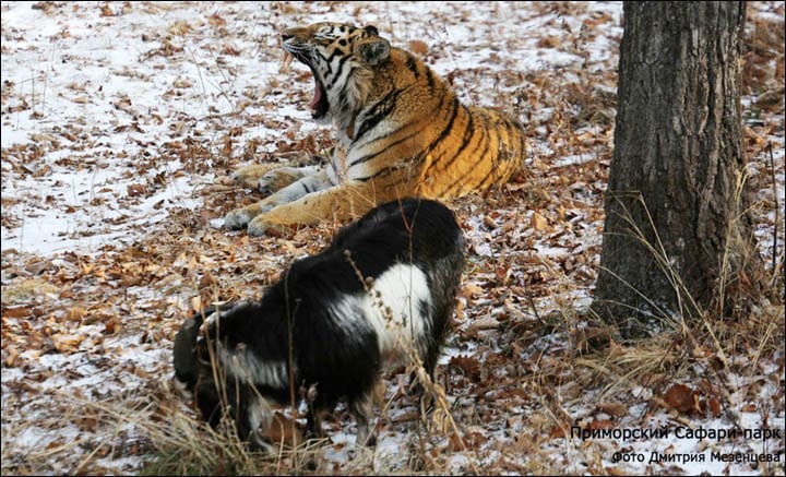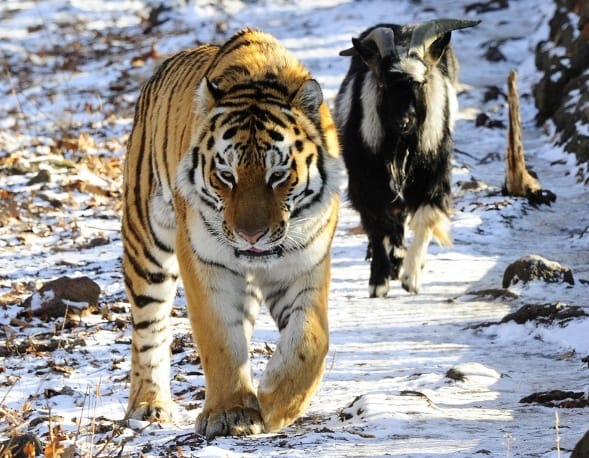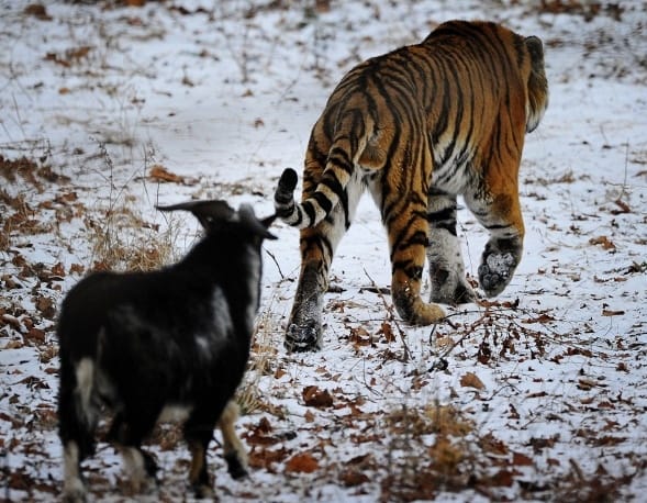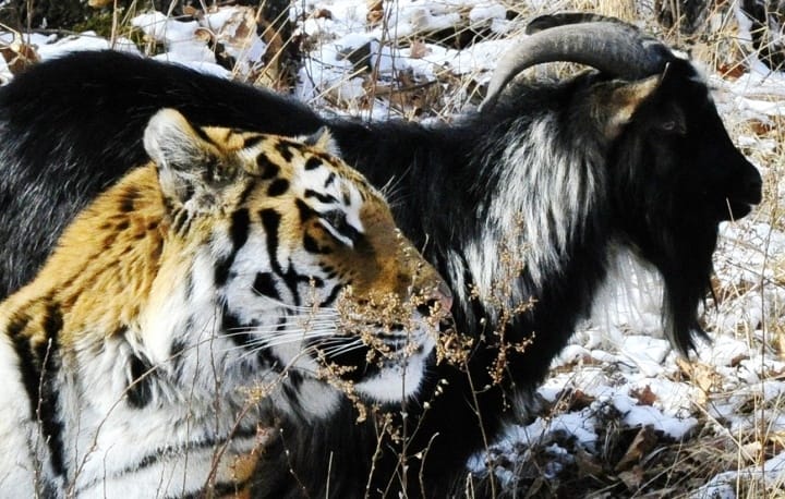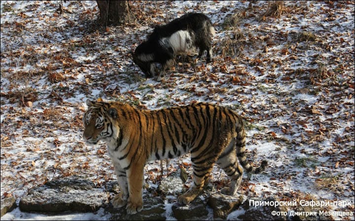 ...No, seriously! Mezentsev continued, explaining that the tiger and goat eat and walk together, and do not regard themselves as predator and prey. Instead, "the goat considers Amur his leader and follows him everywhere."