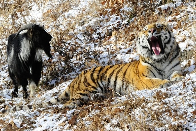 The thing is, though, that while Amur the tiger usually tears its live lunches to shreds, for some reason it didn't immediately maul this little goat. As Safari Park Director Dmitry Mezentsev explained to TASS (the Russian News Agency), "Amur likes to hunt goats and rabbits but he did not want to eat this one as he [the goat] is brave."