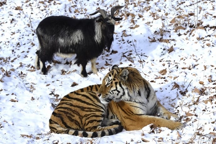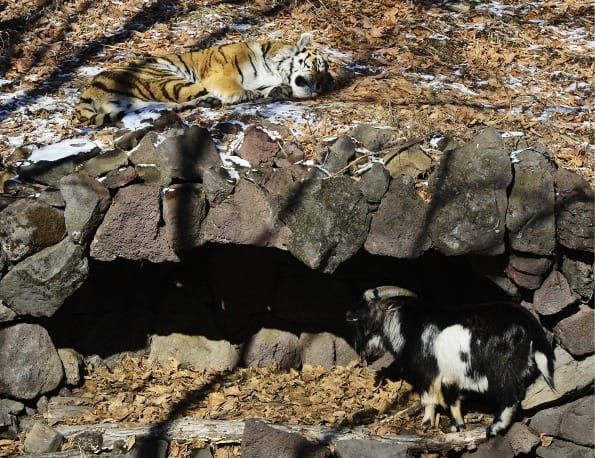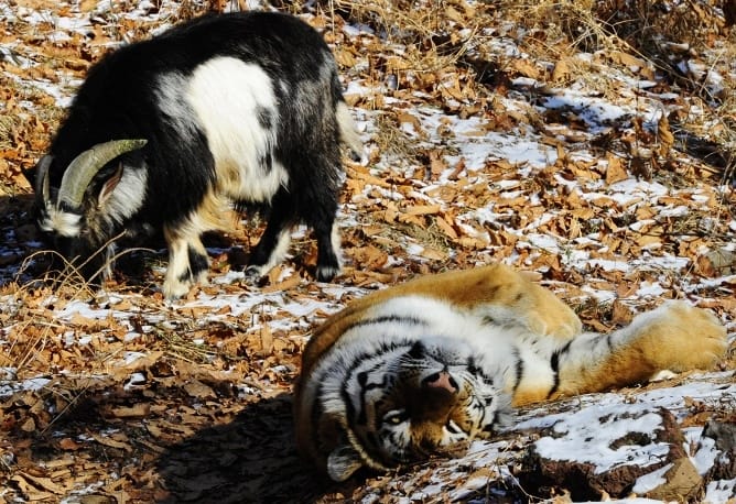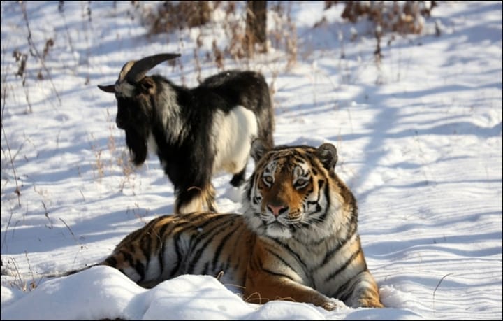 In fact, TASS even reports that the goat (who the zookeepers have since named Timur) "made no attempts to run away from the tiger and now sleeps inside the predator's bed while Amur has to recline on the shelter's roof."